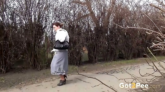 Shy looking brunette chick had to make pee outdoors