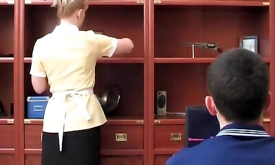 A lustful maid arranged a stormy threesome with a young light-haired and a lustful teen.
